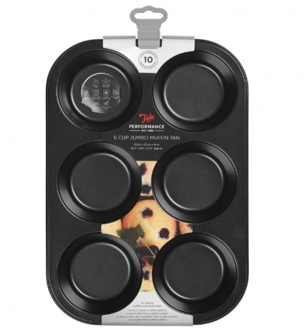 Designed for everyday baking, this 6-cup jumbo muffin tin is suitable for muffins and individual portion cakes. Its inner dimensions are 30.5 × 20.1 × 4.0 cm. The Tala Performance Eclipse dual-layer non-stick coating provides excellent food release, easy cleaning, and long-lasting performance. Made from heavy-weight carbon steel, the tin offers strength, durability, and even heat distribution, and is safe for use with metal utensils. Oven safe up to 240°C / 464°F, it is also suitable for fridge and freezer use and is dishwasher safe.