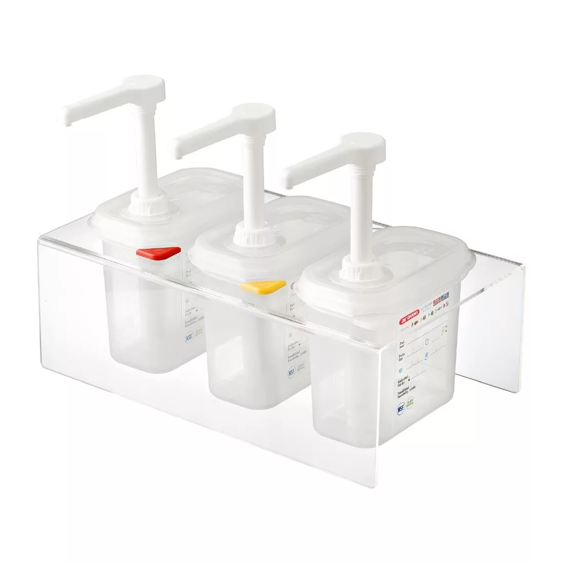 GN 1/9 sized, each dispenser also fits perfectly into food service and storage areas, helping you to maintain practicality and efficiency through every service. The dishwasher-safe, easy-to-clean plastic sauce containers make it simple for you to maintain a hygienic kitchen from beginning to end of service.