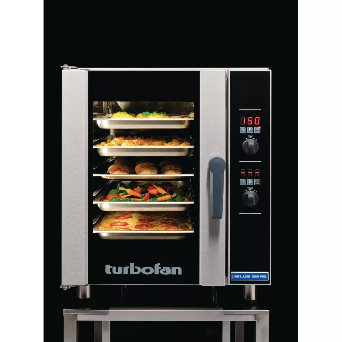 A compact digital convection oven from Blue Seal, which can hold five 1/1 GN trays, with 85mm tray spacing. Fan system ensures even and consistent cooking. Up to 20 programmes can be saved for ease of use.
