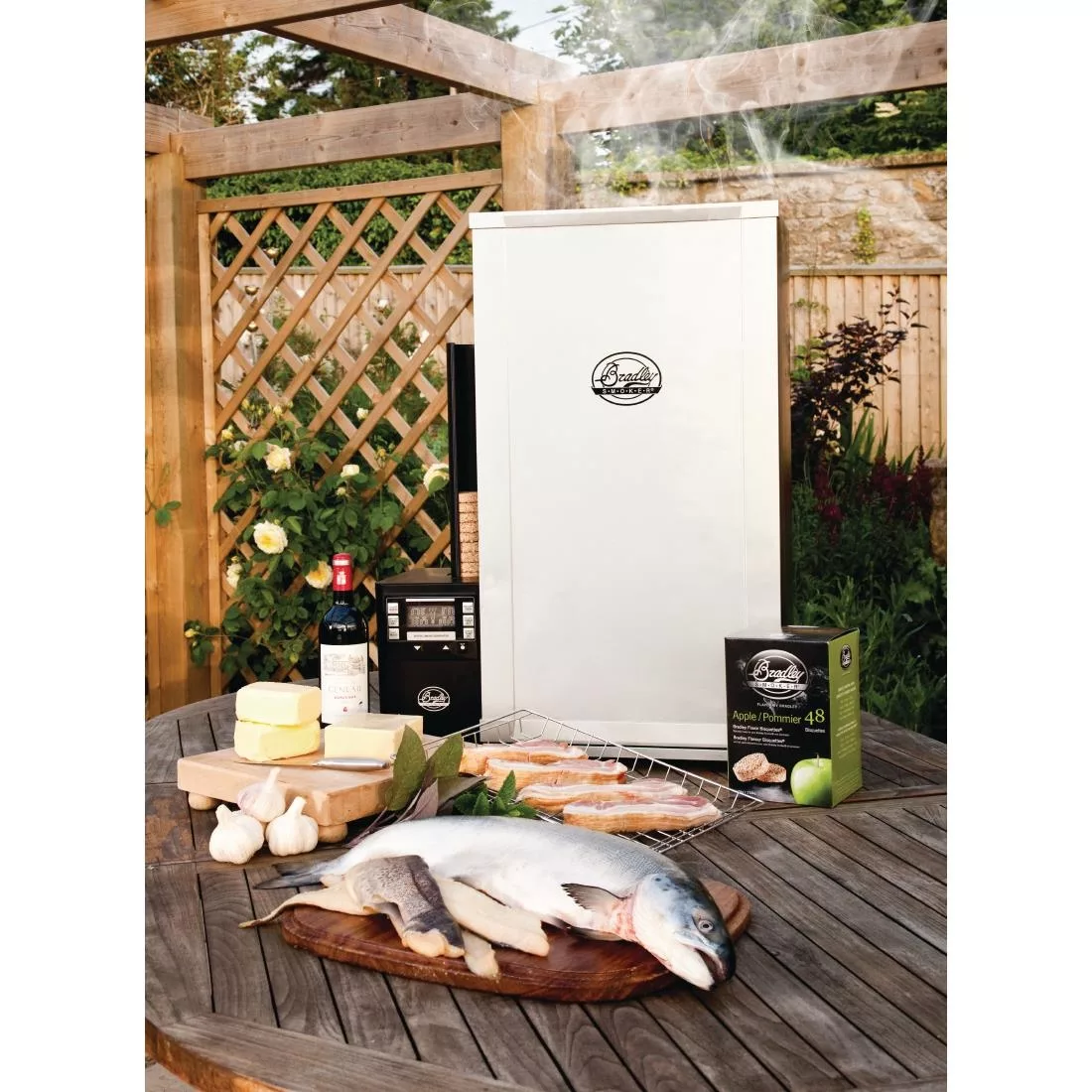 Widely used by gourmet chefs for hot and cold smoking, this Bradley original electric digital food smoker is easily ventilated and portable for indoor and outdoor use. Made from powder epoxy coated steel and with an aluminium interior, the machine features temperature monitoring control for even smoking and contains six shelves. For outdoor use only. Do not operate in an enclosed area.