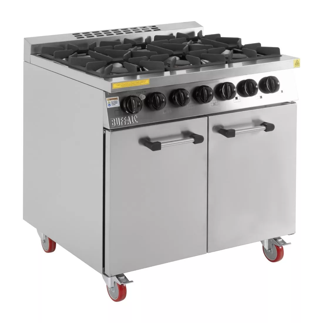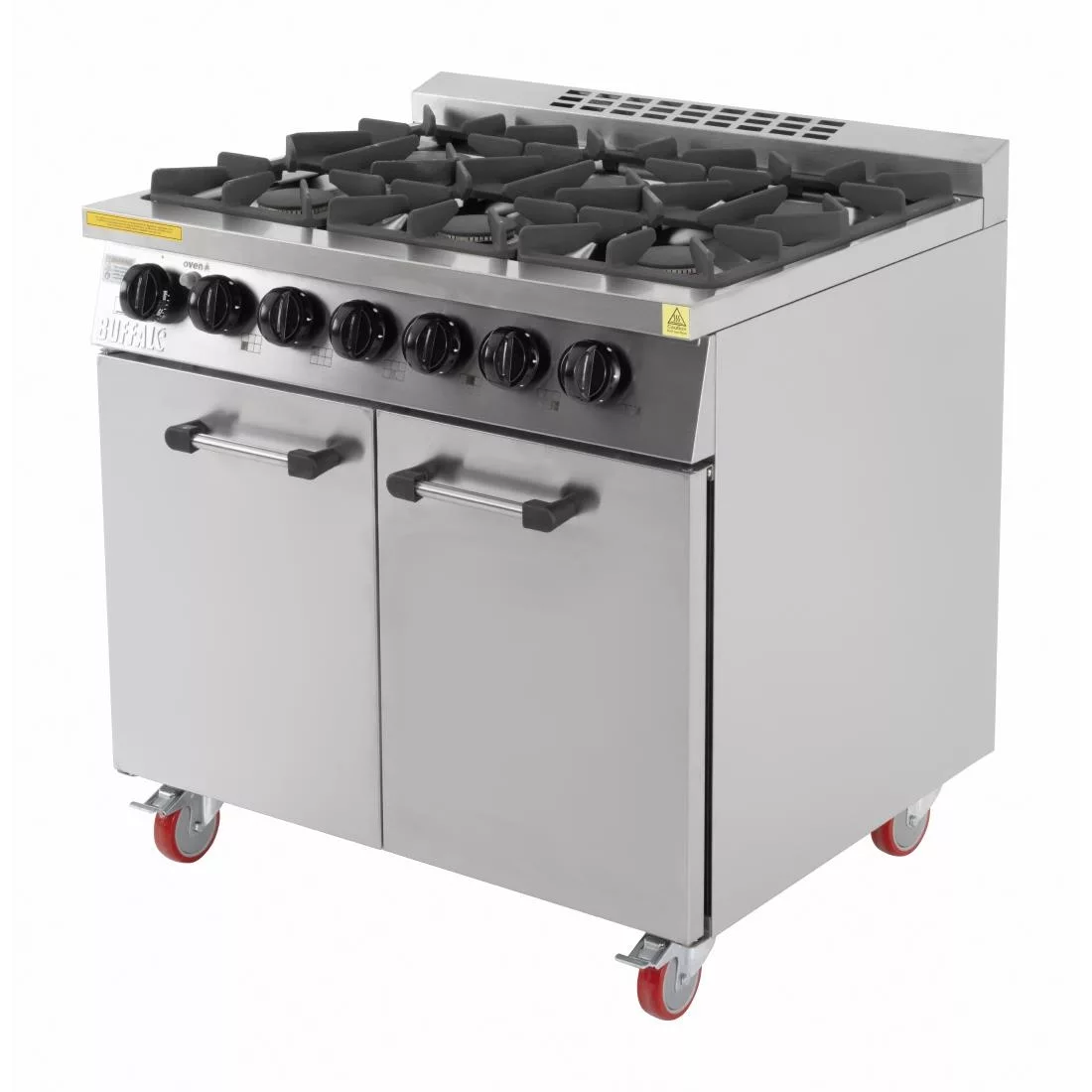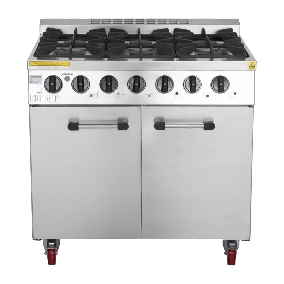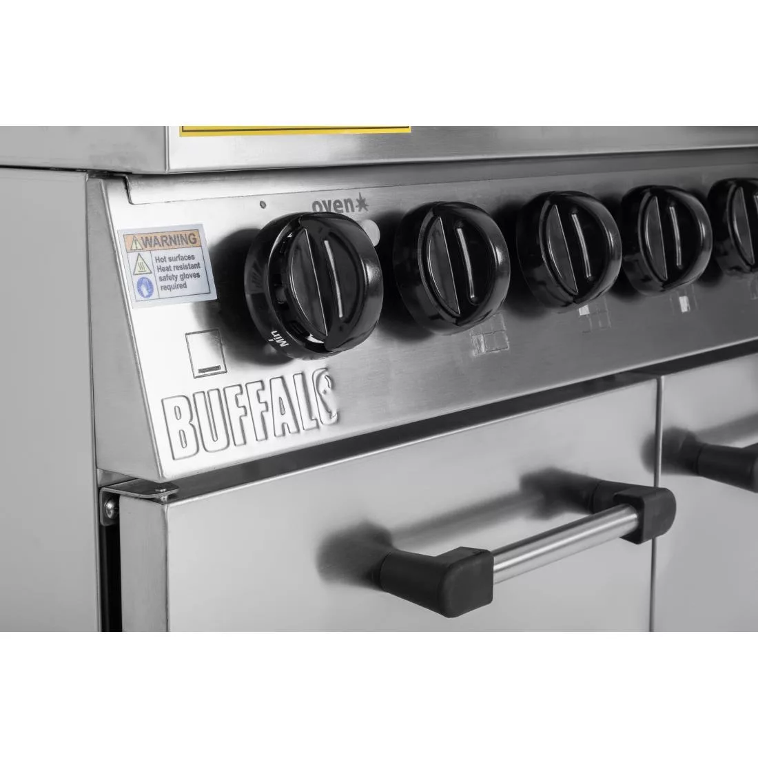 Bring power and reliability into your kitchen with the Buffalo gas oven range. Designed for professional performance and user-friendly operation, the cooker features six 4.3kW burners with incredibly strong cast iron pan supports across the hob – perfect for all your commercial-sized pots and pans. The oven cavity itself has gastronorm compatibility and can accommodate up to five double size (2/1) pans. Combined, these provide impressive cooking capacity, helping you to keep up with demand even during the busiest of services.