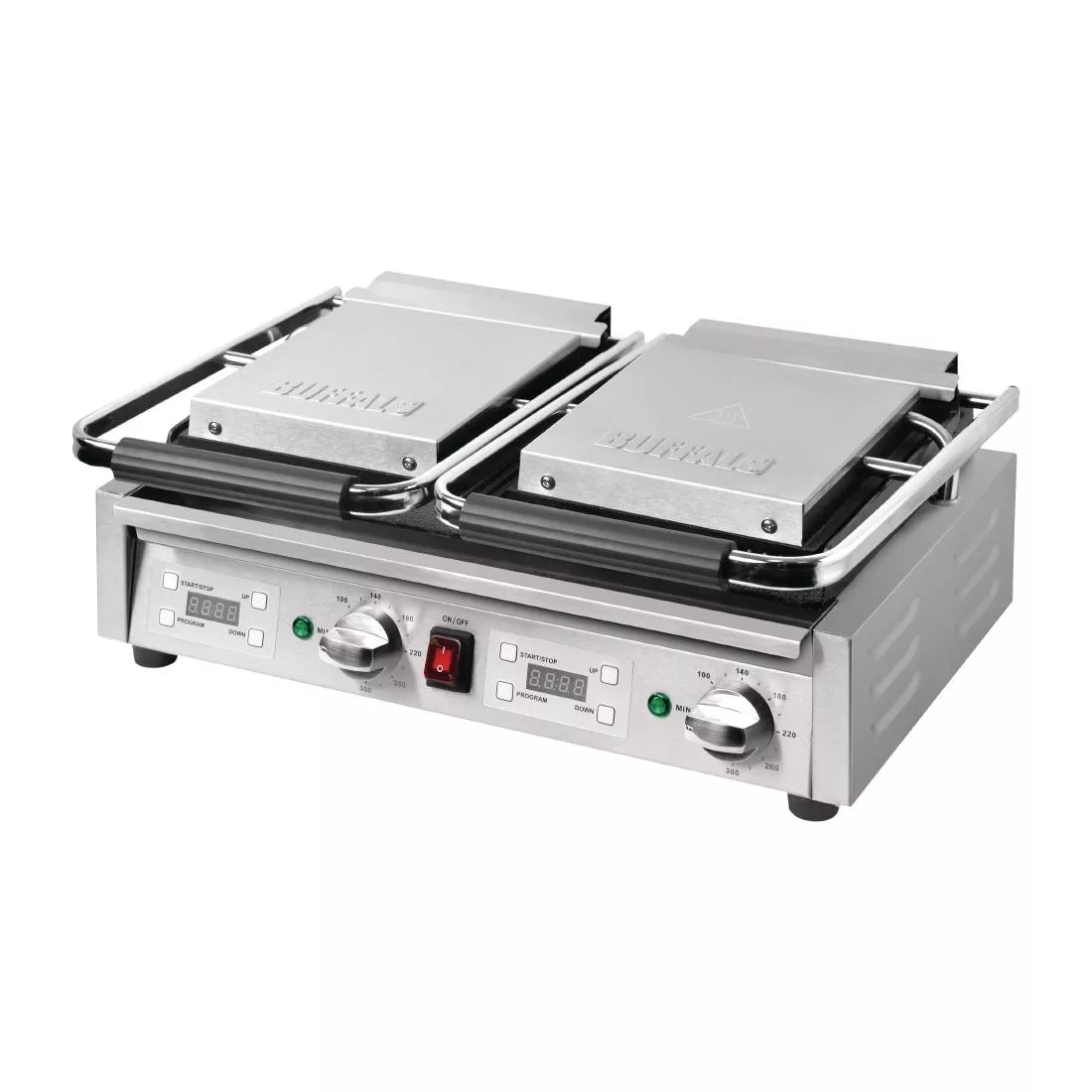 With its rapid heat-up and generously-sized cast iron grilling surface, the Buffalo half ribbed double contact grill is a powerful and reliable addition to professional kitchens. Perfectly designed to produce great tasting food, the grill features independent accurate temperature controls and digital timers for each side, so you’ll always get consistent results, whether you’re making traditional breakfasts or tempting takeaway snacks.