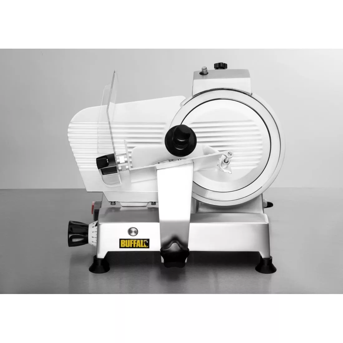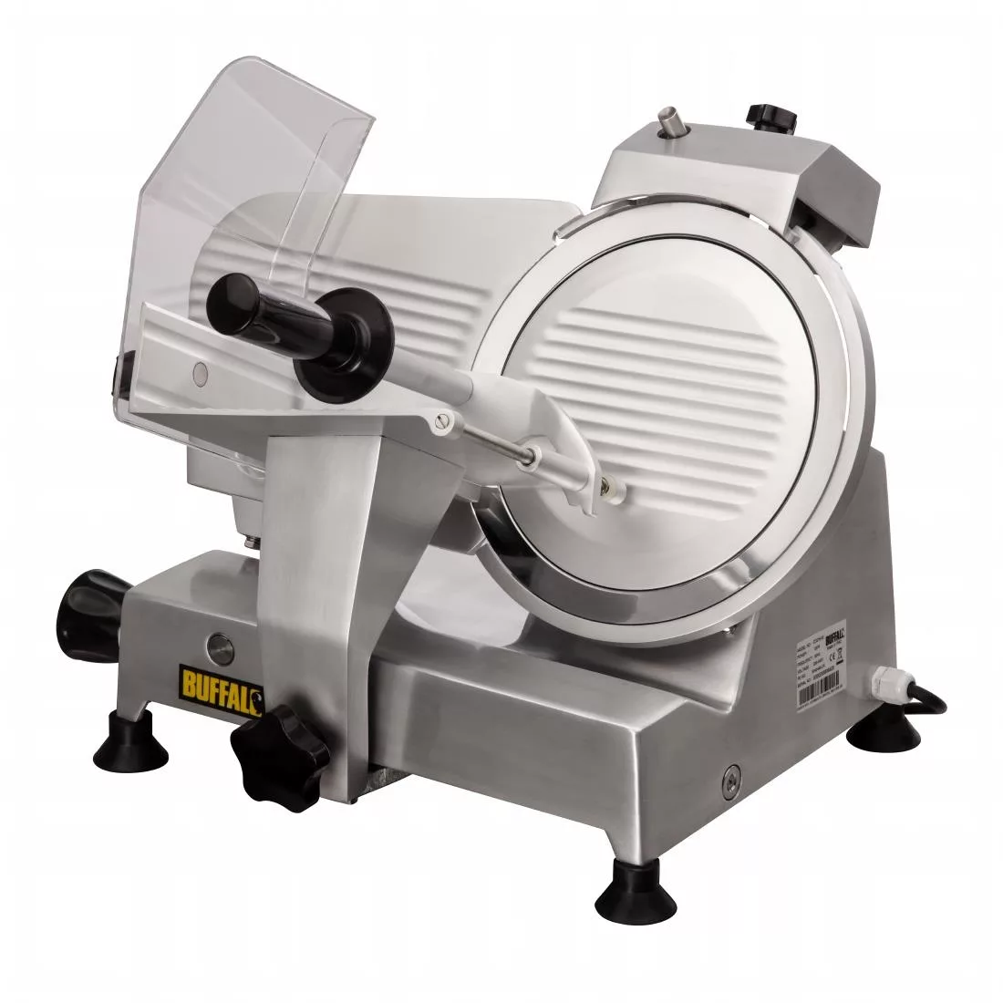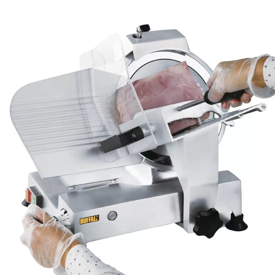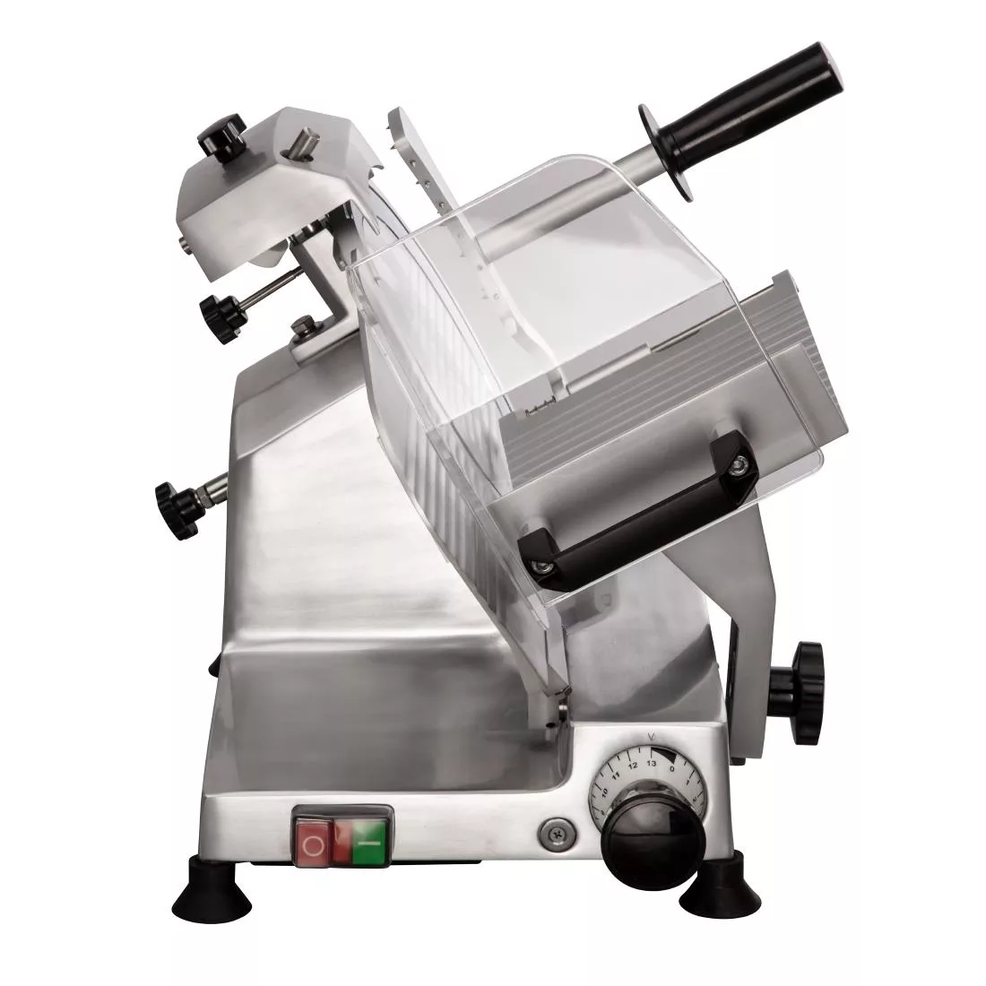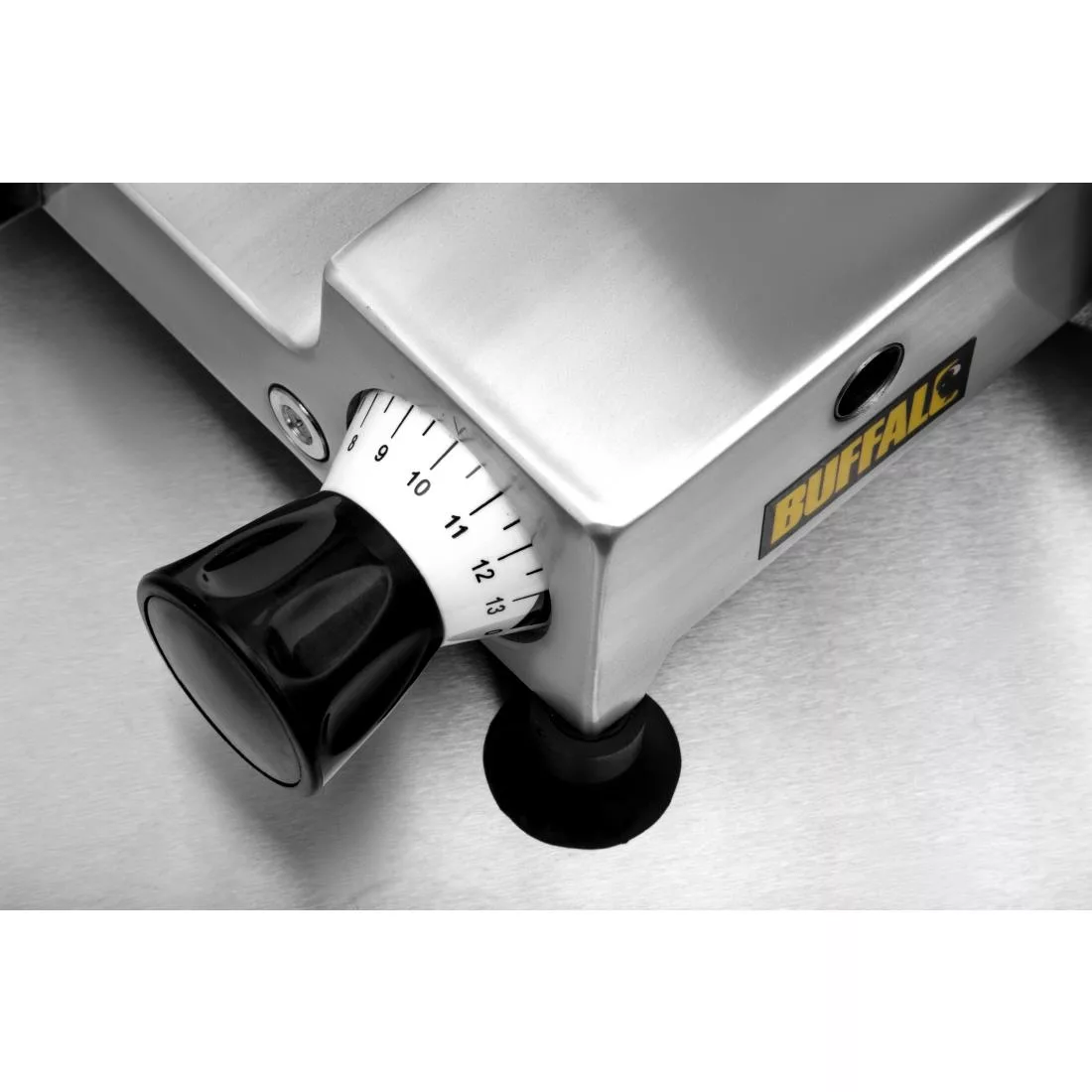 Exceptional cutting strength for large volumes of cooked and cold meats. The food carriage is mounted on ball bearings to ensure smooth gliding action and thickness is manually controlled with side dial.