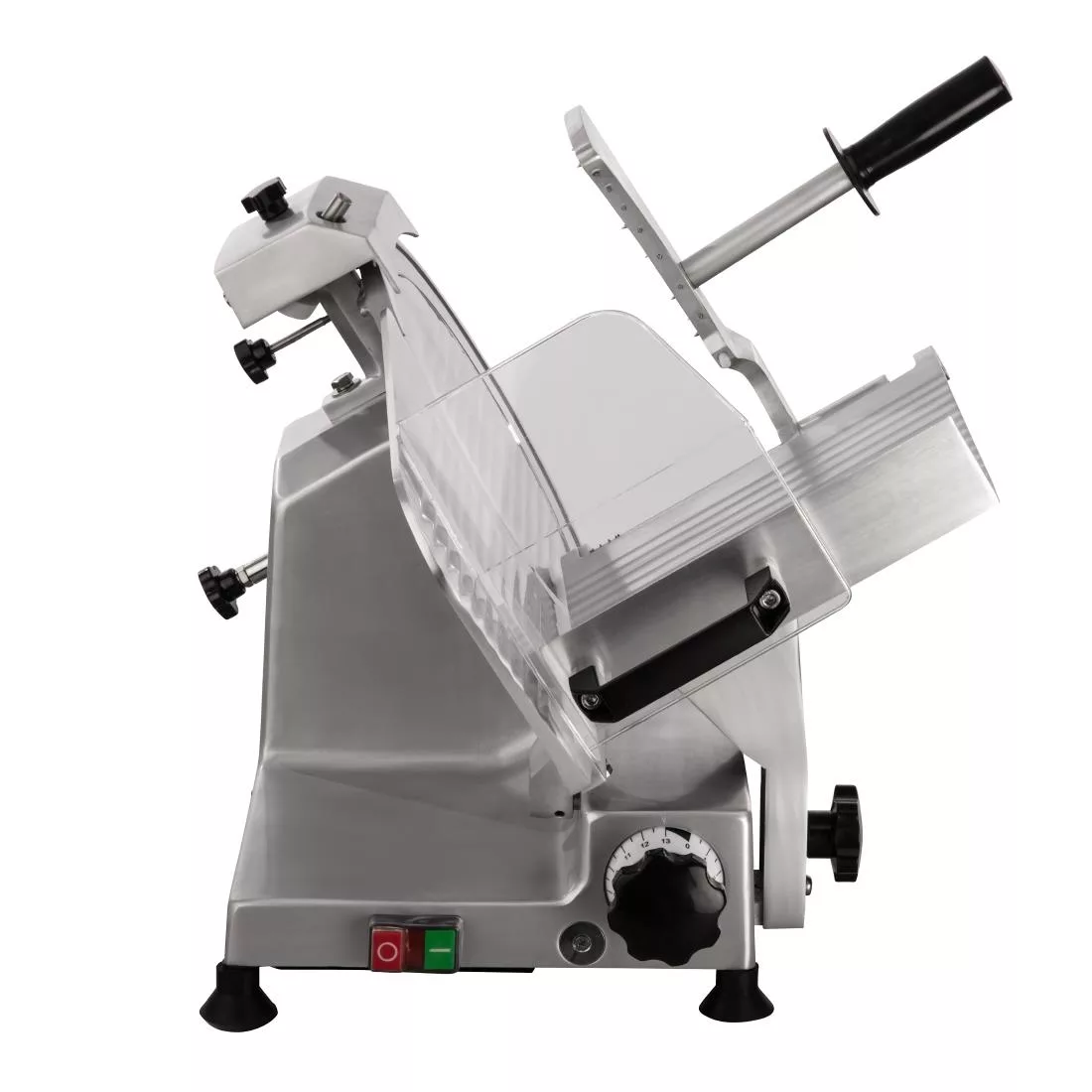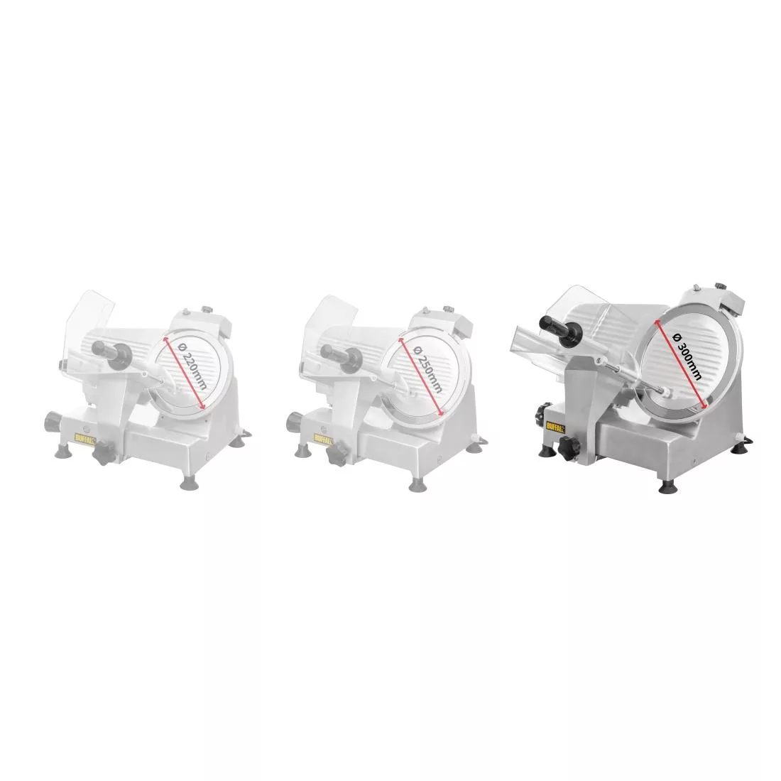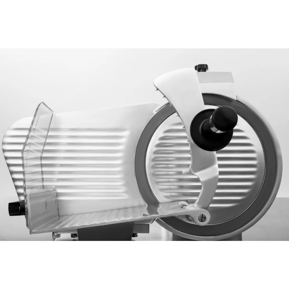 Exceptional cutting strength for large volumes of cooked and cold meats. The food carriage is mounted on ball bearings to ensure smooth gliding action and thickness is manually controlled with side dial.