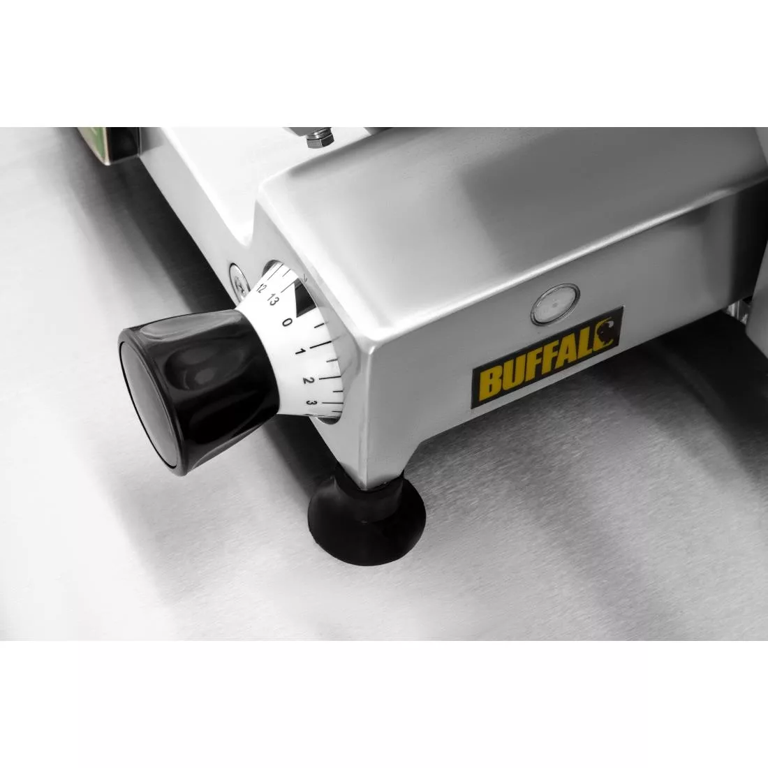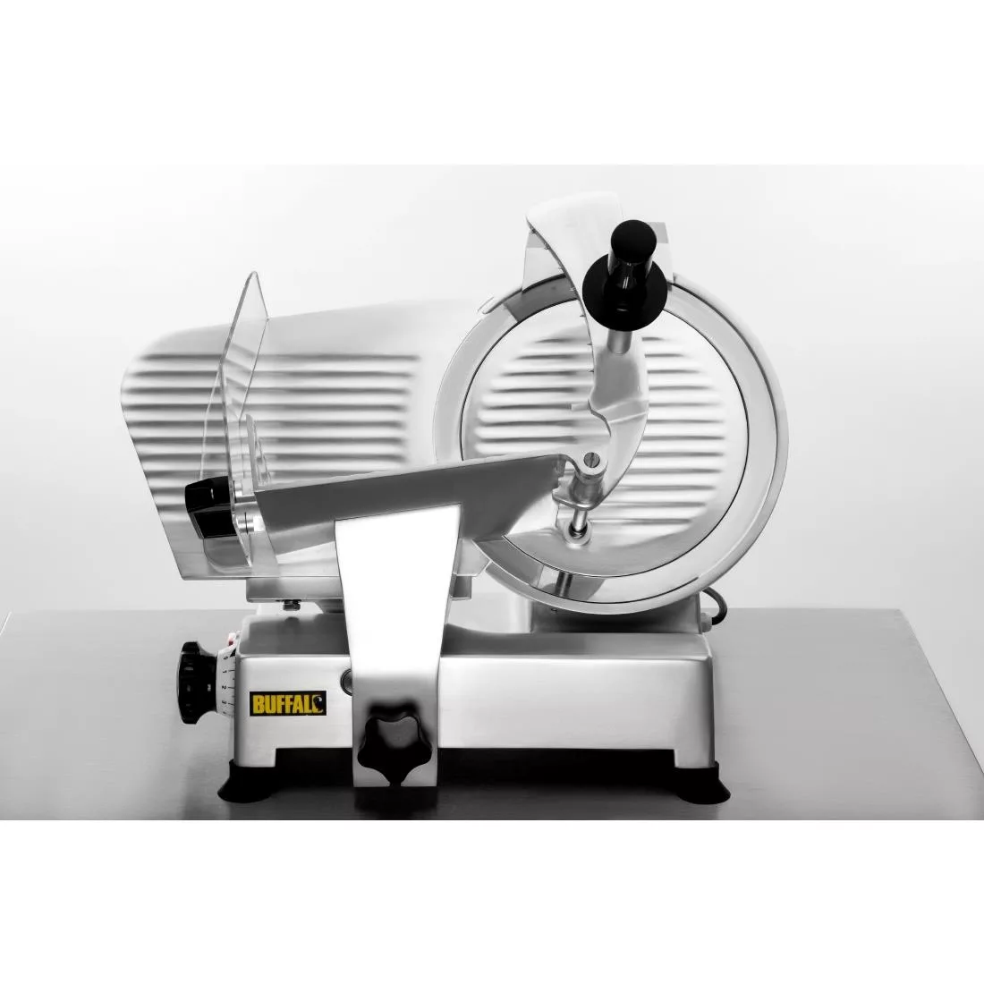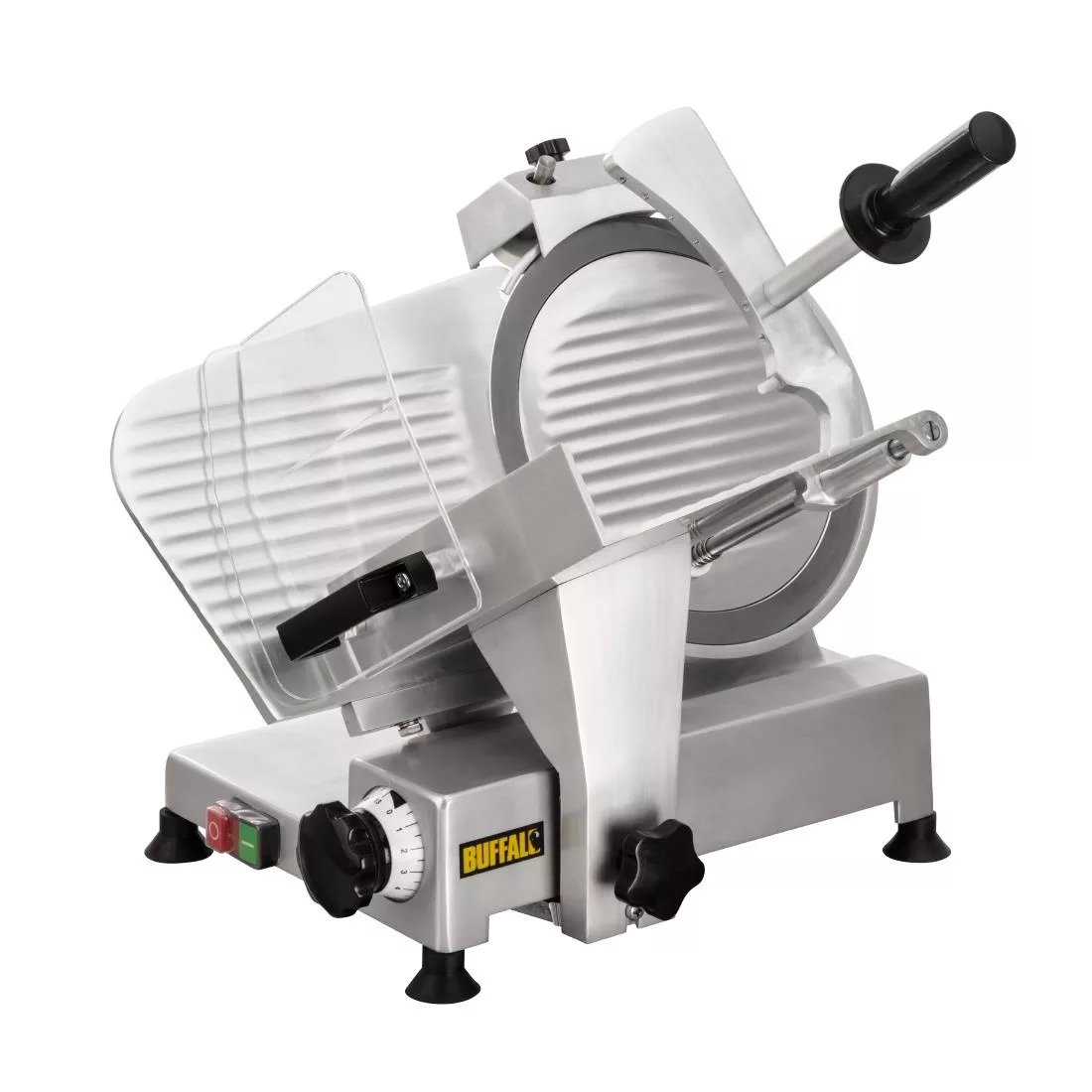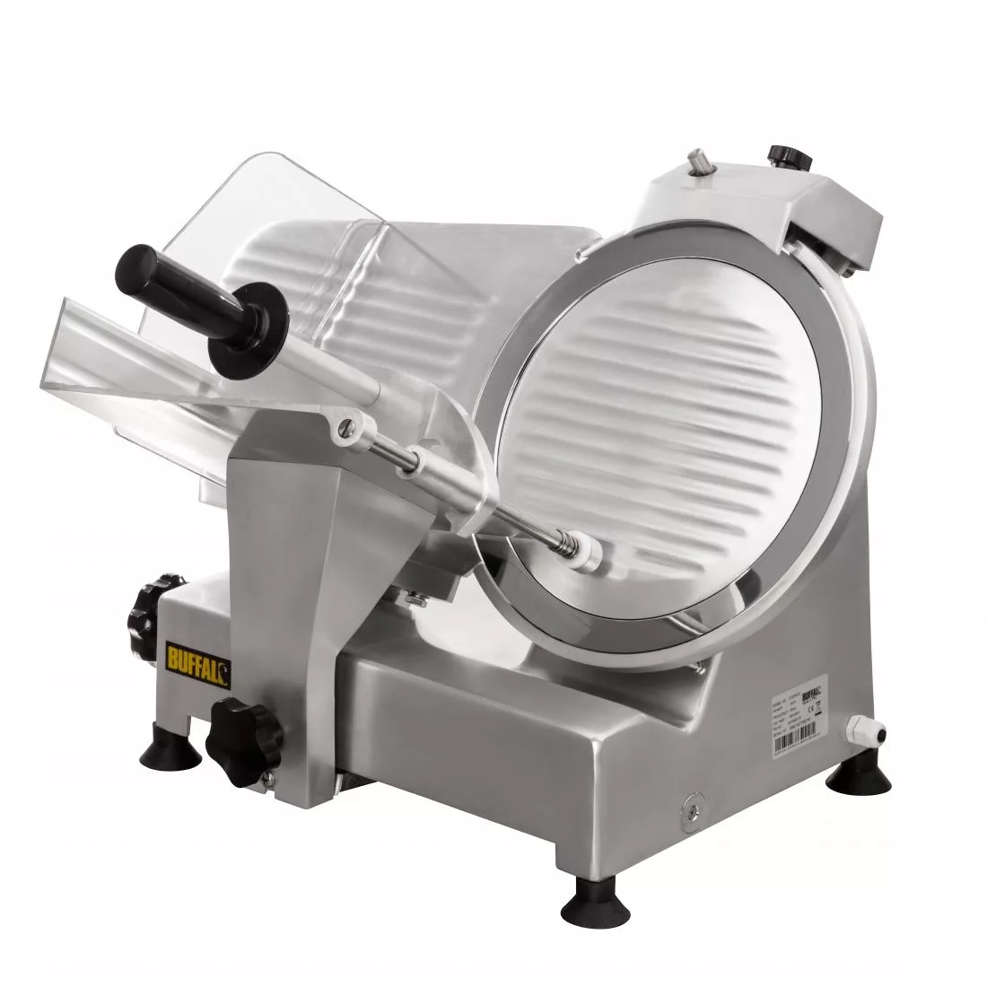 Exceptional cutting strength for large volumes of cooked and cold meats. The food carriage is mounted on ball bearings to ensure smooth gliding action and thickness is manually controlled with side dial.