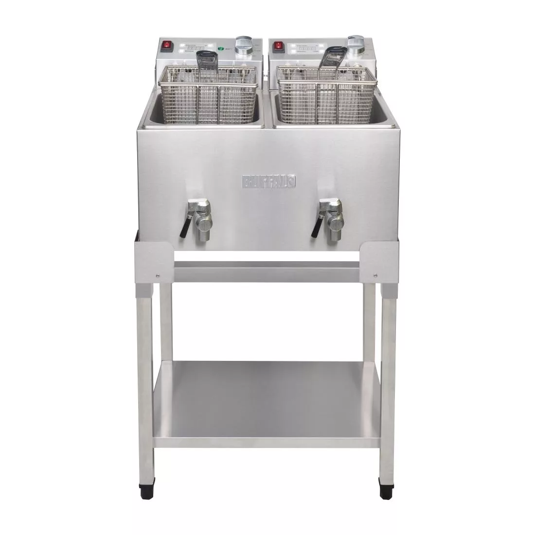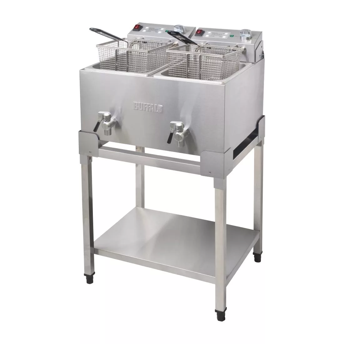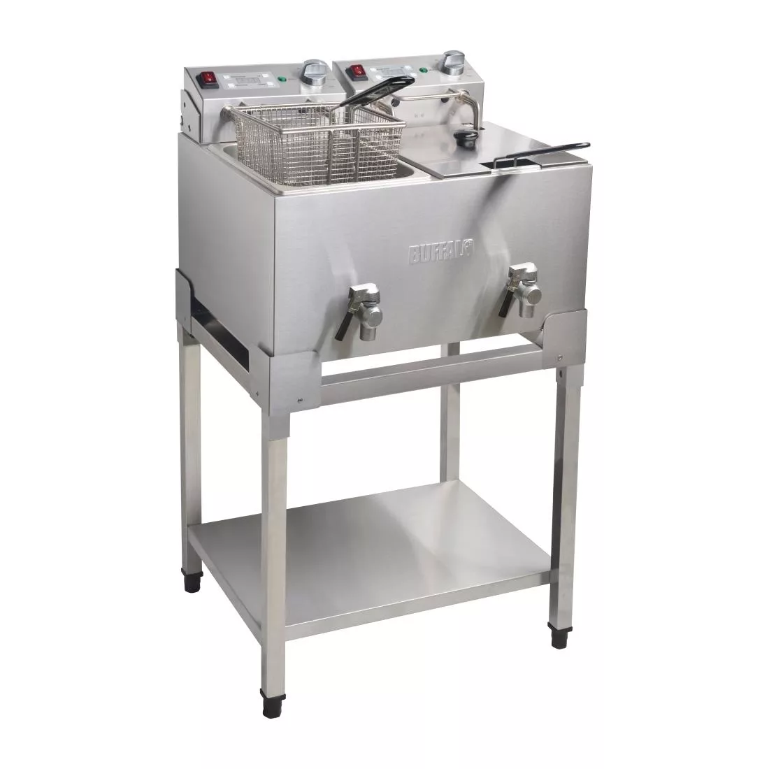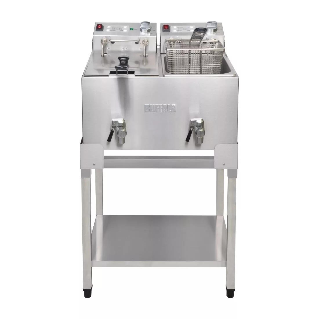 Keep your Buffalo double fryer safe and secure with this commercial-quality stand. With a durable construction, this stainless-steel stand provides a sturdy and secure base for the Buffalo double fryers (FC375 & FC377) – reducing the risk of toppling. Features a lower shelf that allows you to storage fresh oil or non-perishable ingredients, while anti-slip feet help to keep your fryer from moving during use.