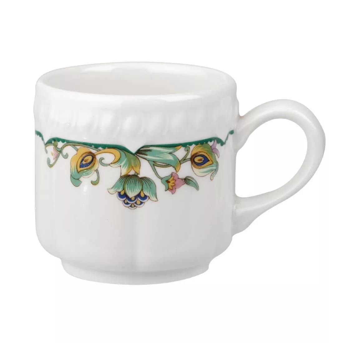 Elegant printed stackable cups by Churchill with a tropical floral design featuring the delicate embossment of the Buckingham shape, featuring a durable glaze which provides an ultra smooth surface for presentation.
