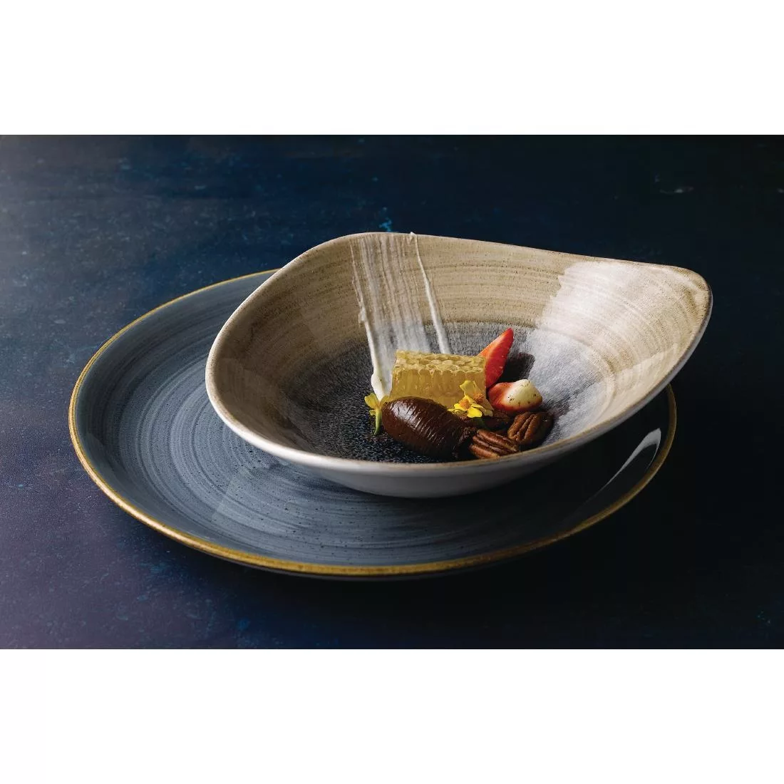 Striking crockery inspired by water. Statement glaze pools in the centre, drawing the eye to whatever is plated. Microwave safe and dishwasher safe. Glazed foot.