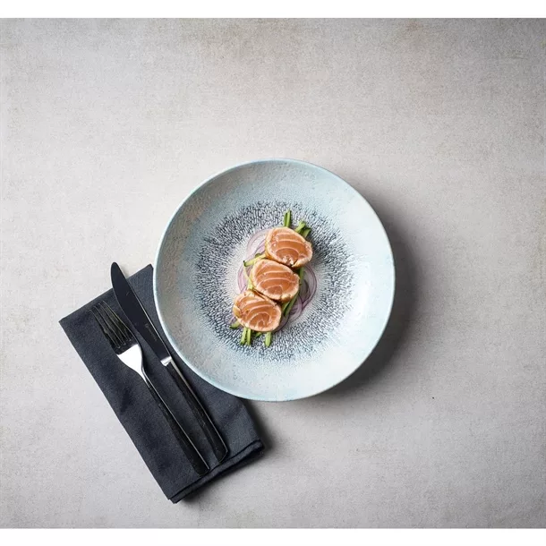 Studio Prints Fusion showcases a textured border effect, inspired by the fusion of multi-tonal reactive glazes. Radial and expressive, this design blends colour and texture with a contemporary white centre, ideal for framing premium food presentation.