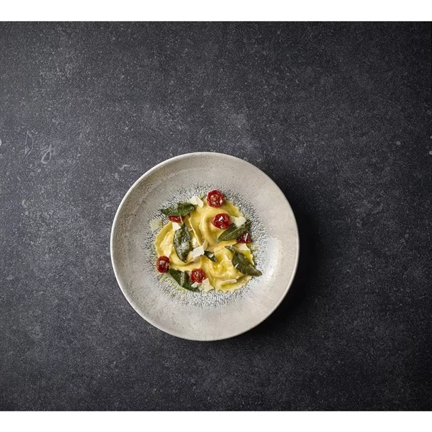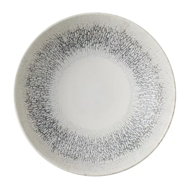 Studio Prints Fusion showcases a textured border effect, inspired by the fusion of multi-tonal reactive glazes. Radial and expressive, this design blends colour and texture with a contemporary white centre, ideal for framing premium food presentation.