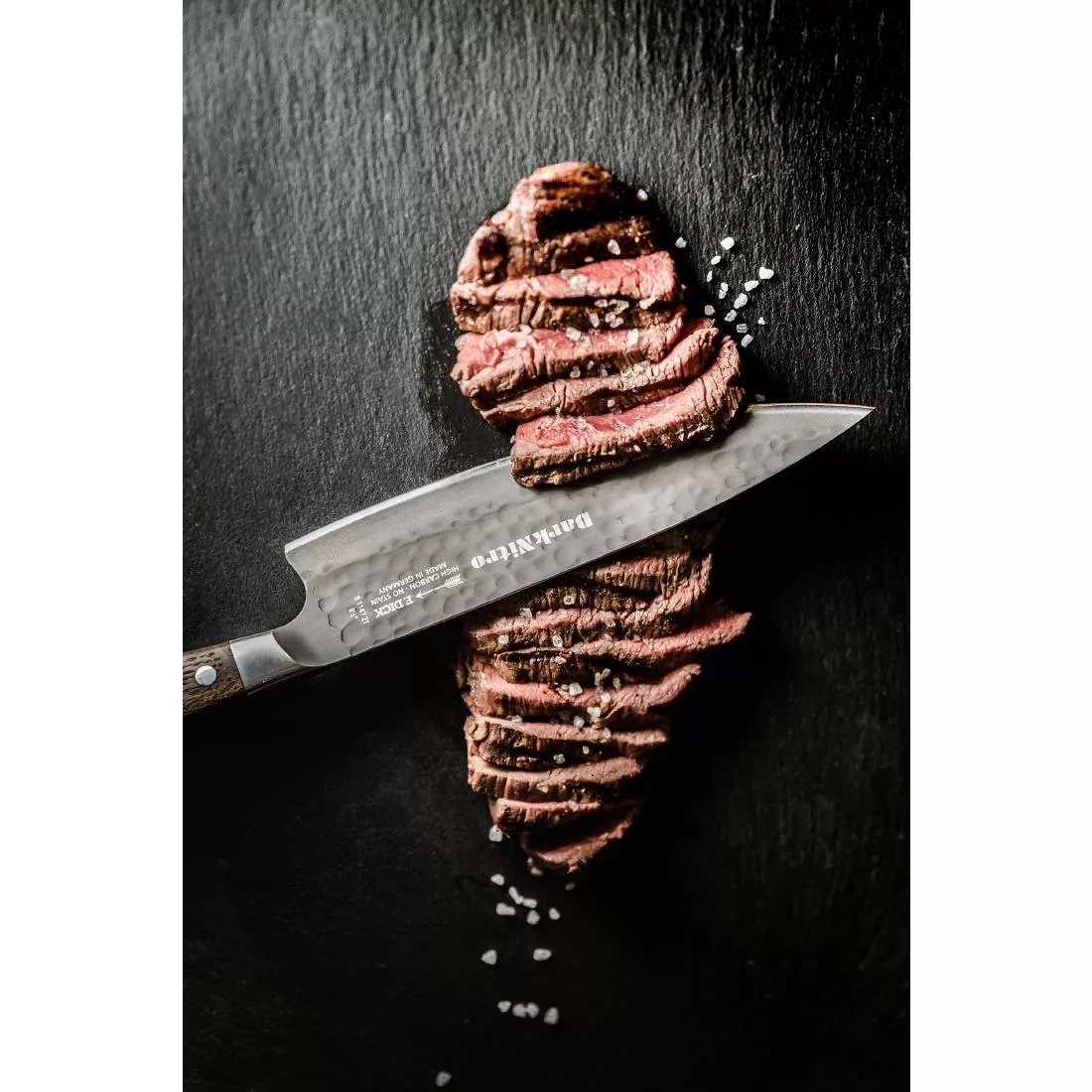Cut, slice or dice meat, fish, fruit and vegetables with ease thanks to this Dick DarkNitro chef knife. Specially designed with a wide, long and ultra-sharp blade, the knife makes light work of cutting even the toughest of produce. Plus, the tapered design allows you to use a rolling technique for delicate and fast-paced slicing.