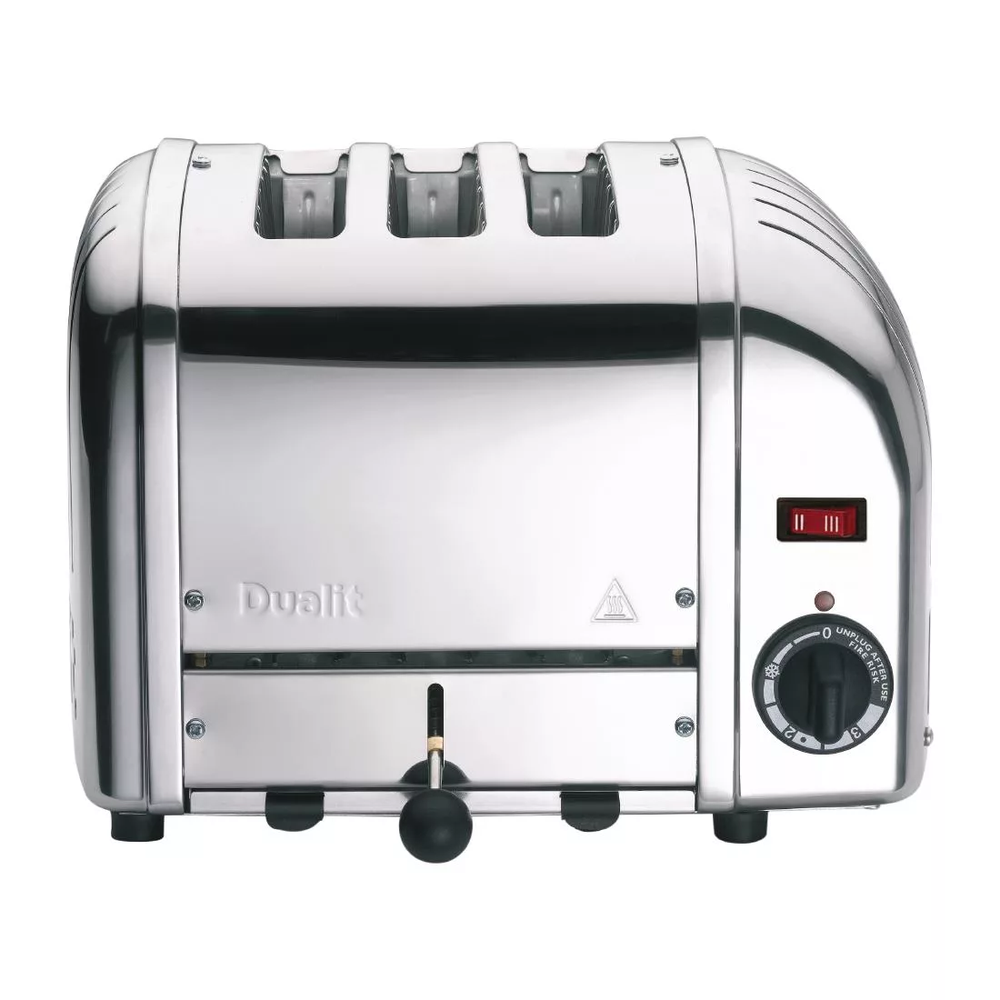 A stylish Dualit toaster in a polished finish, designed for use in a commercial kitchen. Three extra wide 28mm slots allow bread to be toasted in a variety of thicknesses, from sliced loaf to buns, teacakes and bagels. The slots are also wide enough to accommodate a Dualit sandwich cage (available separately) for making hot toasted sandwiches. The toaster is highly versatile thanks to several innovative features: a high lift mechanism for removing small items safely, a mechanical timer to control toasting, a selector switch to use only the slots required and a manually operated ejector lever to keep items warm until needed.