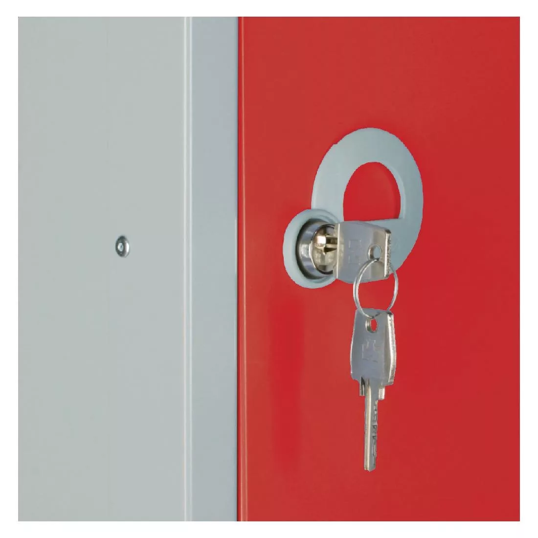 Robust, versatile lockers with a welded plinth between the doors to improve inter-compartment security. Available in 300mm or 450mm depths, one to eight door options, five colours, flat or sloping top and all with either padlock or camlock fittings (padlock not supplied). Single door lockers feature top shelf and double coat hook, double door features doucle coat hooks.