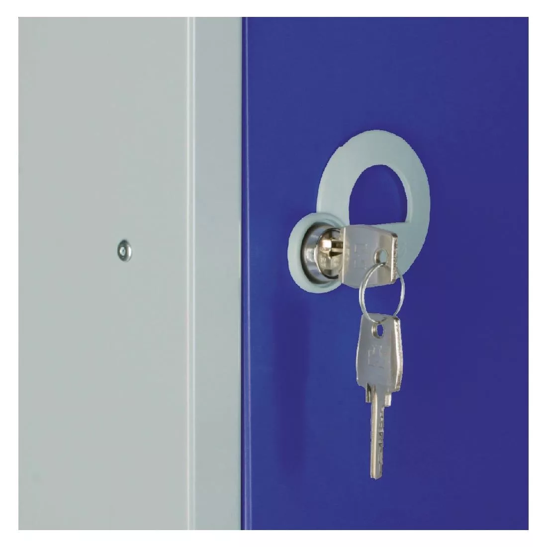 Robust, versatile lockers with a welded plinth between the doors to improve inter-compartment security. Available in 300mm or 450mm depths, one to eight door options, five colours, flat or sloping top and all with either padlock or camlock fittings (padlock not supplied). Single door lockers feature top shelf and double coat hook, double door features doucle coat hooks.