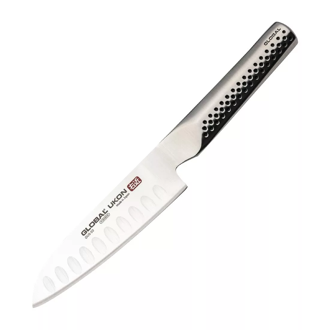 The name “UKON” has many positive connotations in Japanese legend, and in true GLOBAL tradition, the GLOBAL UKON series is constructed from the finest CROMOVA 18 Stainless Steel material and features thicker blades to enhance performance. The Global Ukon GUS-20 Small Santoku Knife is a great all-round knife and one of its key features is the indentations on the cutting edge. These small divets create little air pockets between the blade and your ingredients, to prevent slices from sticking as you cut. The GUS-20 is excellent for prepping medium vegetables, meat and fish.