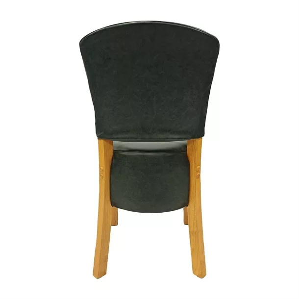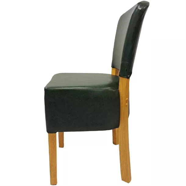 Designed specifically for commercial spaces, this Hanoi dining chair in soft oak makes a striking statement in any setting. The chair features a gracefully rounded back and is upholstered in a cedar green faux leather which is comfortable to sit on and easy to wipe clean. Built with durability in mind, it guarantees lasting use and boasts a CRIB 5 fire retardant rating for added safety.