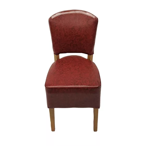 Designed specifically for commercial spaces, this Hanoi deep seat dining chair in weathered oak makes a striking statement in any setting. The chair features a gracefully rounded back and is upholstered in a bordeaux red faux leather which is comfortable to sit on and easy to wipe clean. Built with durability in mind, it guarantees lasting use and boasts a CRIB 5 fire retardant rating for added safety.