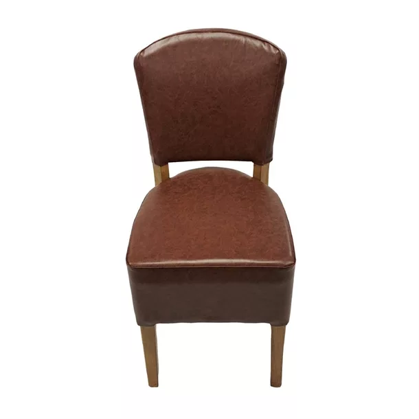 Designed specifically for commercial spaces, this Hanoi deep seat dining chair in weathered oak makes a striking statement in any setting. The chair features a gracefully rounded back and is upholstered in an espresso brown faux leather which is comfortable to sit on and easy to wipe clean. Built with durability in mind, it guarantees lasting use and boasts a CRIB 5 fire retardant rating for added safety.