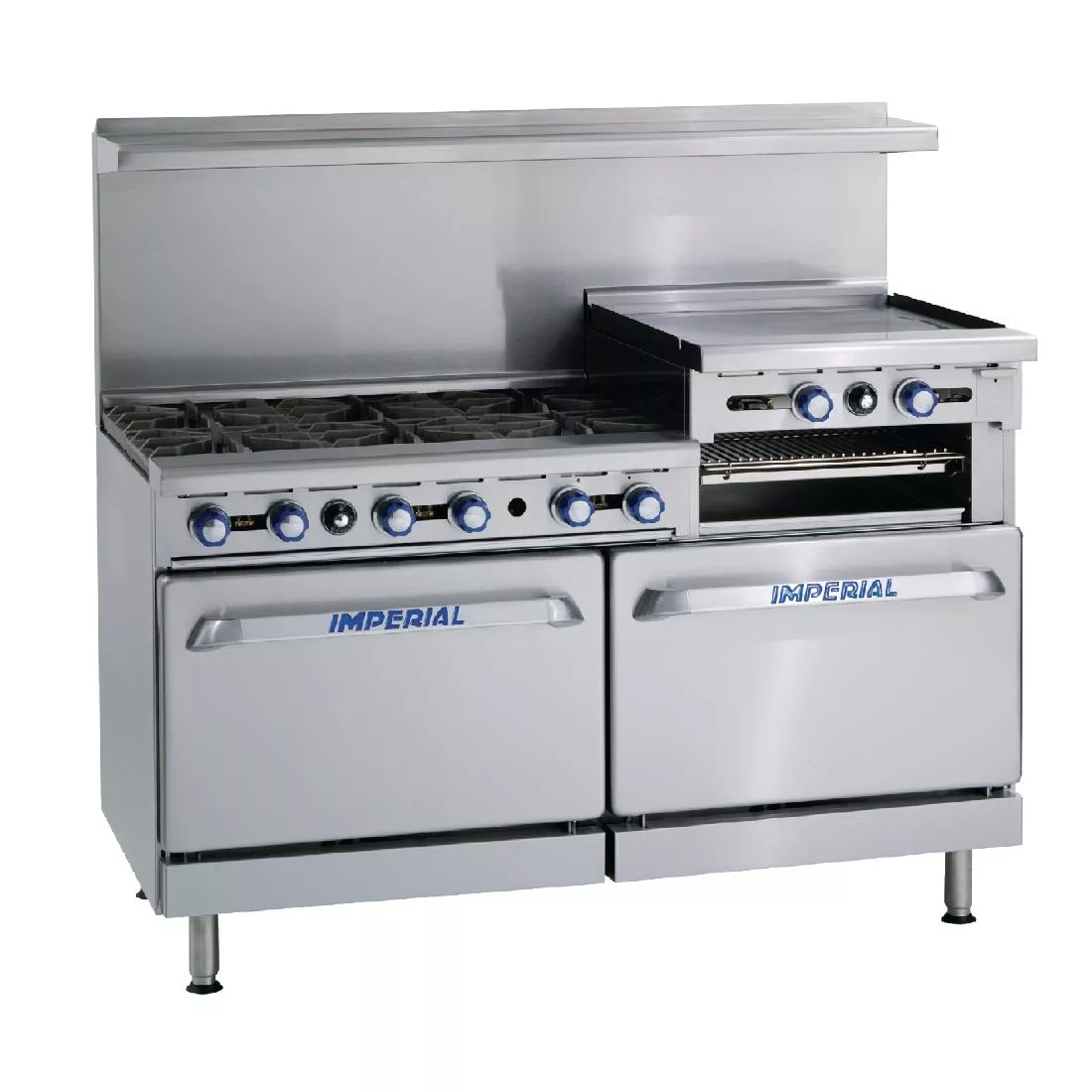 A powerful, versatile Imperial range with six gas burners, two standard, independently controlled gas ovens and a raised griddle with broiler, allowing many types of dishes to be cooked at one time, in a variety of ways. The ovens are powerful and robust, with U-shaped oven burners and unique burner baffles that distributes heat flow for an even temperature and therefore even cooking, and a heat deflector directs reflected heat back in to the oven. The hob is easy to use, with cast iron grates allowing pots to slide easily from section to section and the range is also easy to clean thanks to removable powerful anti-clogging burner heads and a porcelainised oven interior. When installing, allow for a minimum depth of 850mm.