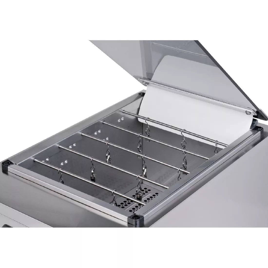 This large Instanta sous vide digital water bath is simple to operate with a rotary temperature control. The push-button controlled agitator pump system circulates water within the tank to maintain constant water temperature and separate timer buttons allow several batches of food to be monitored simultaneously. All timers increase incrementally to the set time, indicating how long food has been cooking for, rather than displaying how long there is left on the timer. A low water level warning and auto cut-off ensure water never falls below safe operating level. The water bath also features a heavy-duty hinged lid with a safety glass monitoring panel. A rack system and clips are included for hanging bags in bath, and the stainless steel tanks are easy to clean.