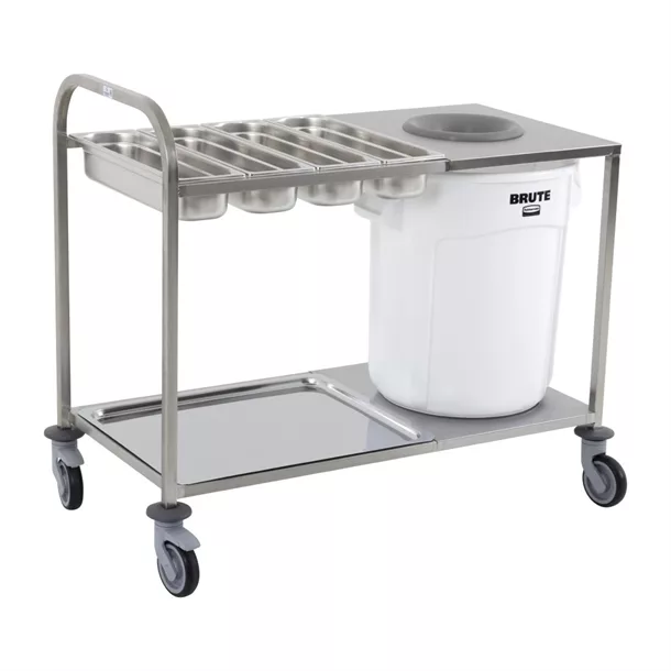 The trolley is also supplied with a tough 76 litres polyethylene waste bucket, making the trolley perfect for scraping away food scraps and easily transporting it to wherever needed. On top, the trolley features a handy push bar and four 2/4 size gastronorm trays – perfect for utensils or cutlery.