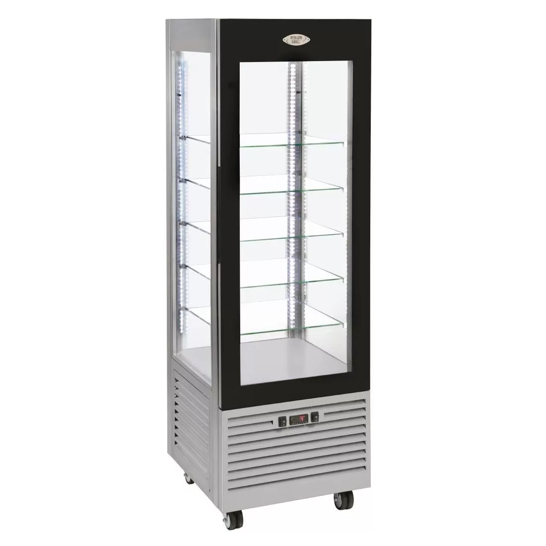 The RD600 FI Roller Grill Free Standing Refrigerated Display Unit in Stainless Steel is an excellent choice if you need to display chilled cakes or desserts. Supplied with five fixed glass shelves, the display unit stylishly highlights your products with efficient LED lighting and sleek black construction. Food is kept at the perfect serving temperature, thanks to effective refrigeration which is regulated by a simple, yet accurate digital control panel. Easy to use and clean.