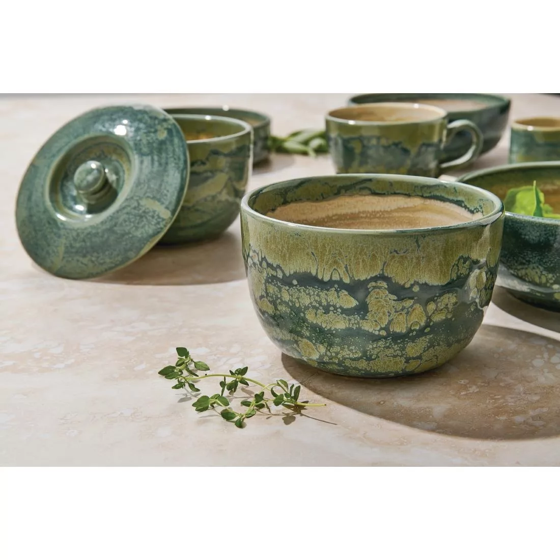 New Revolution Aurora Jade Bowl 15.5cm (6 1/8″) 65.5cl, 23oz. Aurora uses reactive glazes in combination to achieve stunning colour and contrast effects. Aurora is backwards compatible with both Revolution and Vesuvius ranges to further extend a creative and versatile presentation. Whether it¿s main course, sides or dessert, the Aurora collection provides the perfect solution for all types of cuisine.