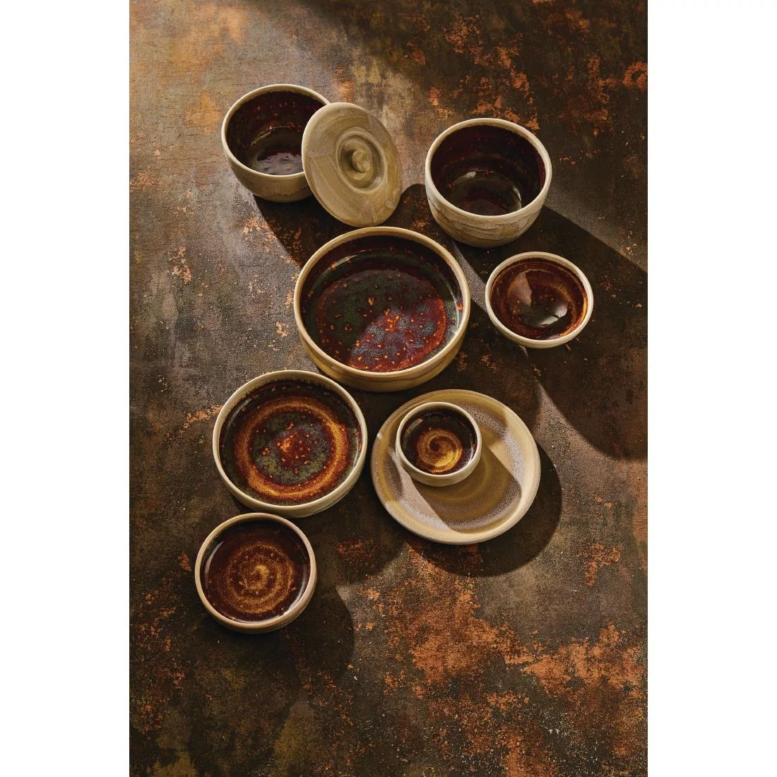 New Vesuvius Aurora Amber Bowl 11.5cm (4 1/2″) 45.5cl, 16oz. Aurora uses reactive glazes in combination to achieve stunning colour and contrast effects. Aurora is backwards compatible with both Revolution and Vesuvius ranges to further extend a creative and versatile presentation. Whether it¿s main course, sides or dessert, the Aurora collection provides the perfect solution for all types of cuisine.