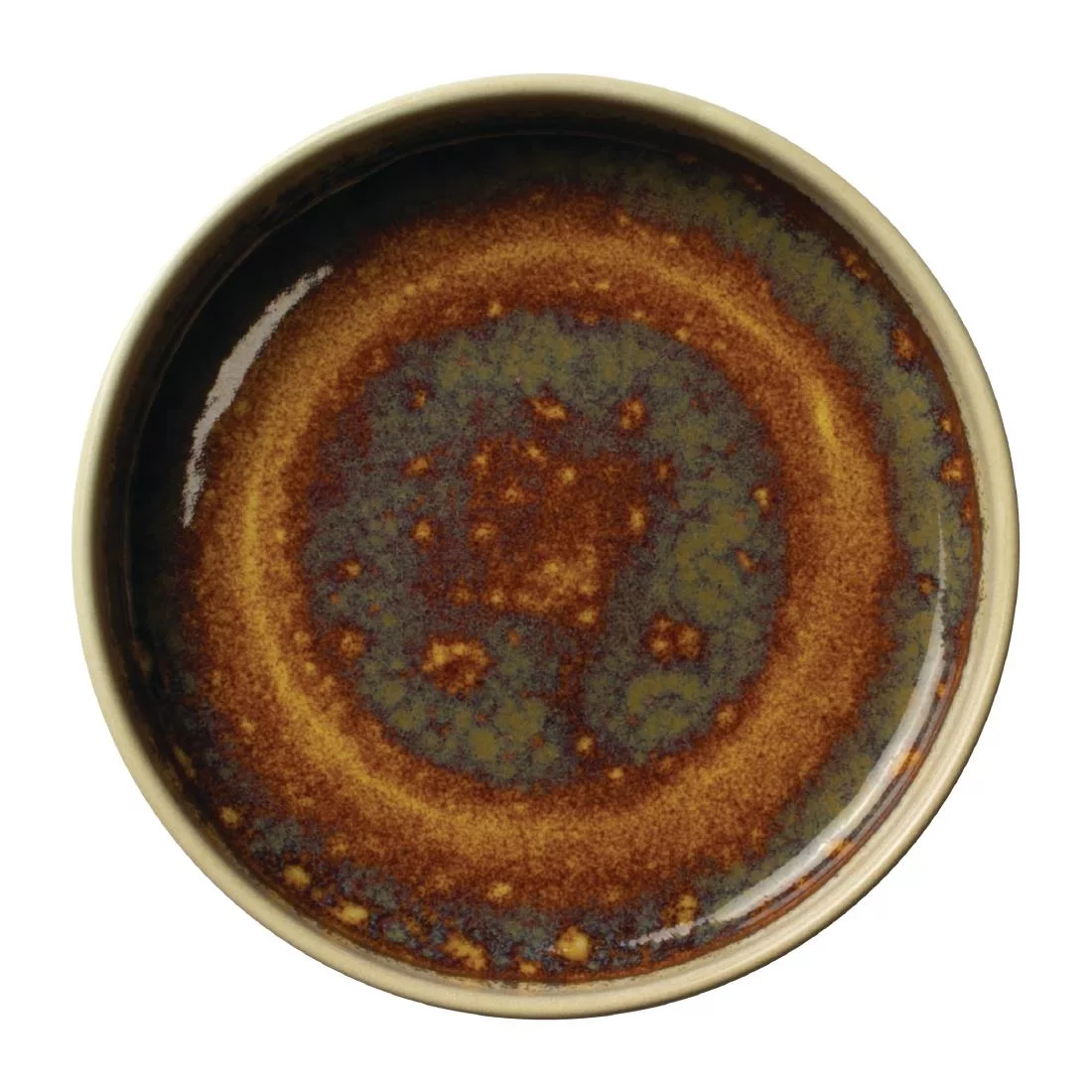 New Vesuvius Aurora Amber Round Stack Plate 13.5cm (5 1/2″) 10.2oz. Aurora uses reactive glazes in combination to achieve stunning colour and contrast effects. Aurora is backwards compatible with both Revolution and Vesuvius ranges to further extend a creative and versatile presentation. Whether it¿s main course, sides or dessert, the Aurora collection provides the perfect solution for all types of cuisine.