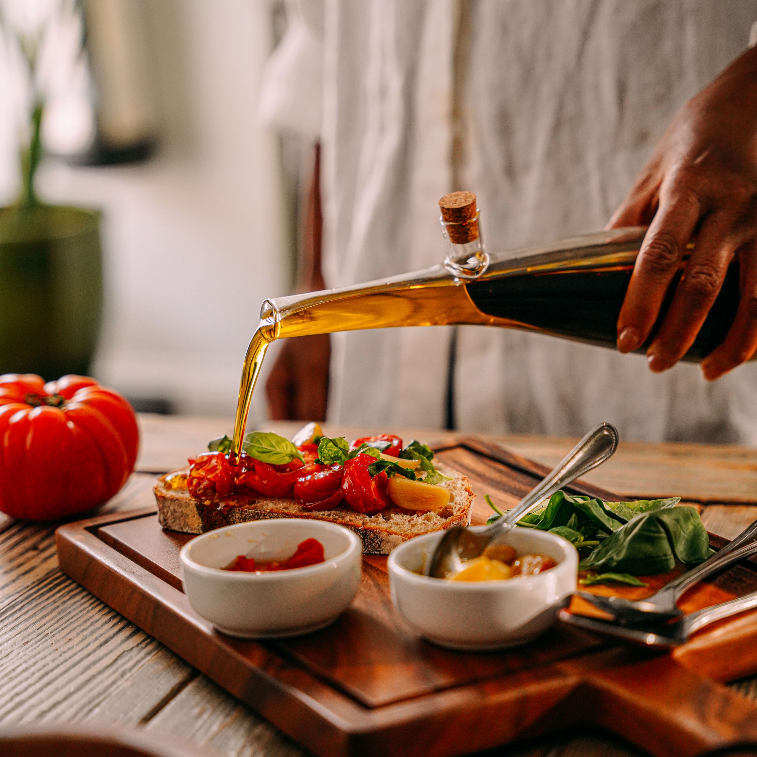 An elegant glass drizzler for storing and pouring oil and vinegar, featuring a 125 ml inner bottle and 275 ml outer bottle. Cork stoppers keep contents fresh and full of flavour, making it ideal for serving with bread, focaccia, or salads.