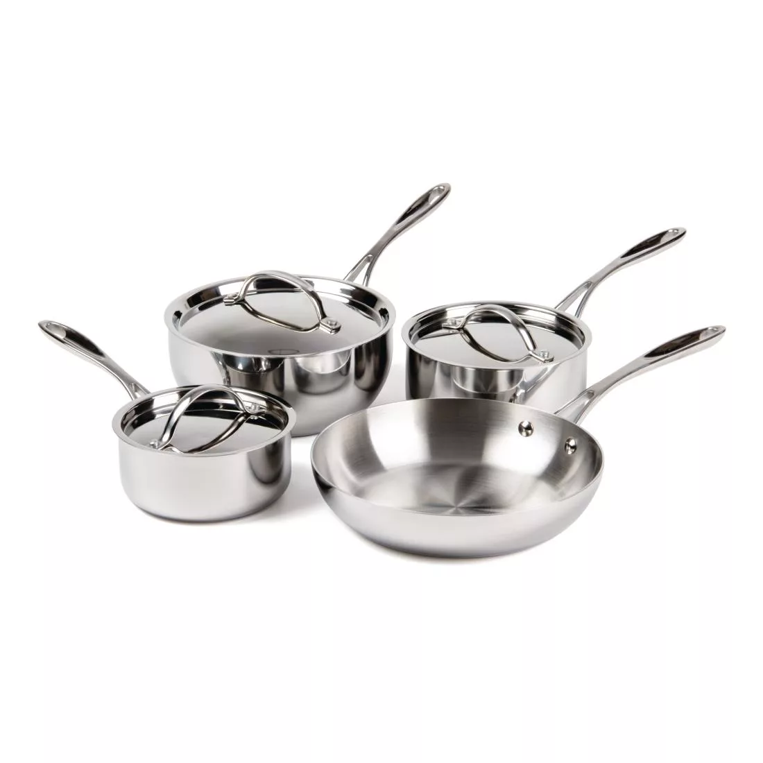 Includes 2x saucepans, 1x flared sauté pan, 1x frying pan and 3x lids Induction compatible.
