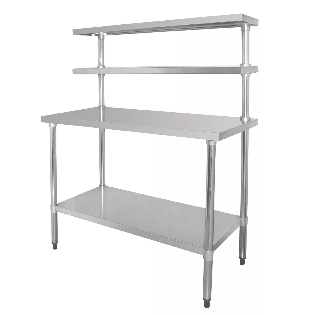 High quality polished finish stainless steel units with two gantry shelves providing maximum storage space above worktops and galvanised undershelf.