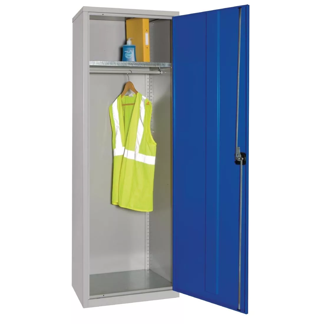 This functional wardrobe locker will make a great addition to staff rooms, industrial environments and more. With one long adjustable shelf supporting a long hanging rail, this clothing locker offers plenty of storage space, and thanks to the lockable doors, it also provides all the security necessary to keep your valuables safe. This clothing locker is coloured blue.