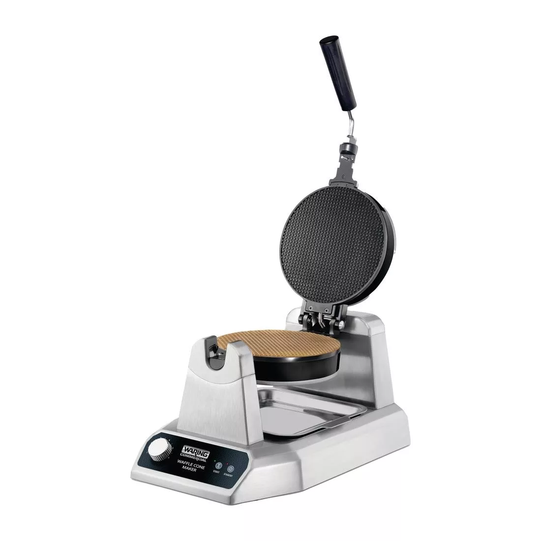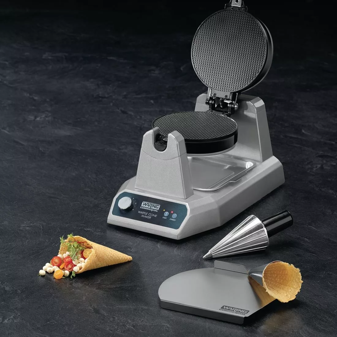 The Waring Commercial waffle maker includes a rolling and forming tool for shaping cones.