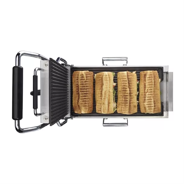 Designed to conserve valuable countertop space, the WPG200K Waring panini maker fits in tight spaces while maximizing output. Make up to four panini sandwiches at once on ribbed cast-iron plates crafted for quick and even cooking. The variable temperature dial makes it easy to cook a variety of foods to perfection, from paninis and burgers to chicken, vegetables and more. Heat-resistant handles help prevent mishaps. The brushed stainless steel body wipes clean in seconds, and the removable tray slides out to empty.