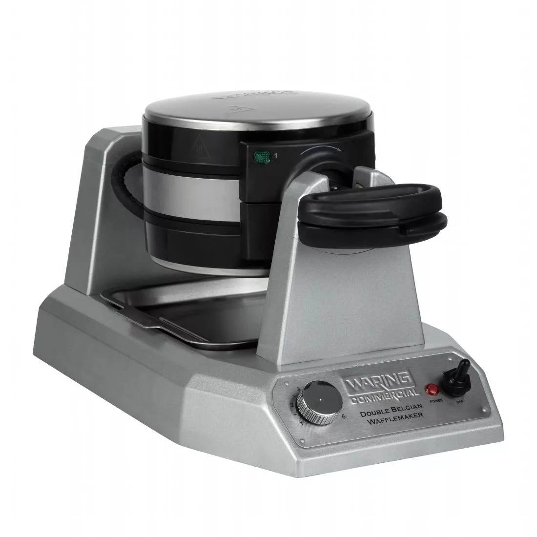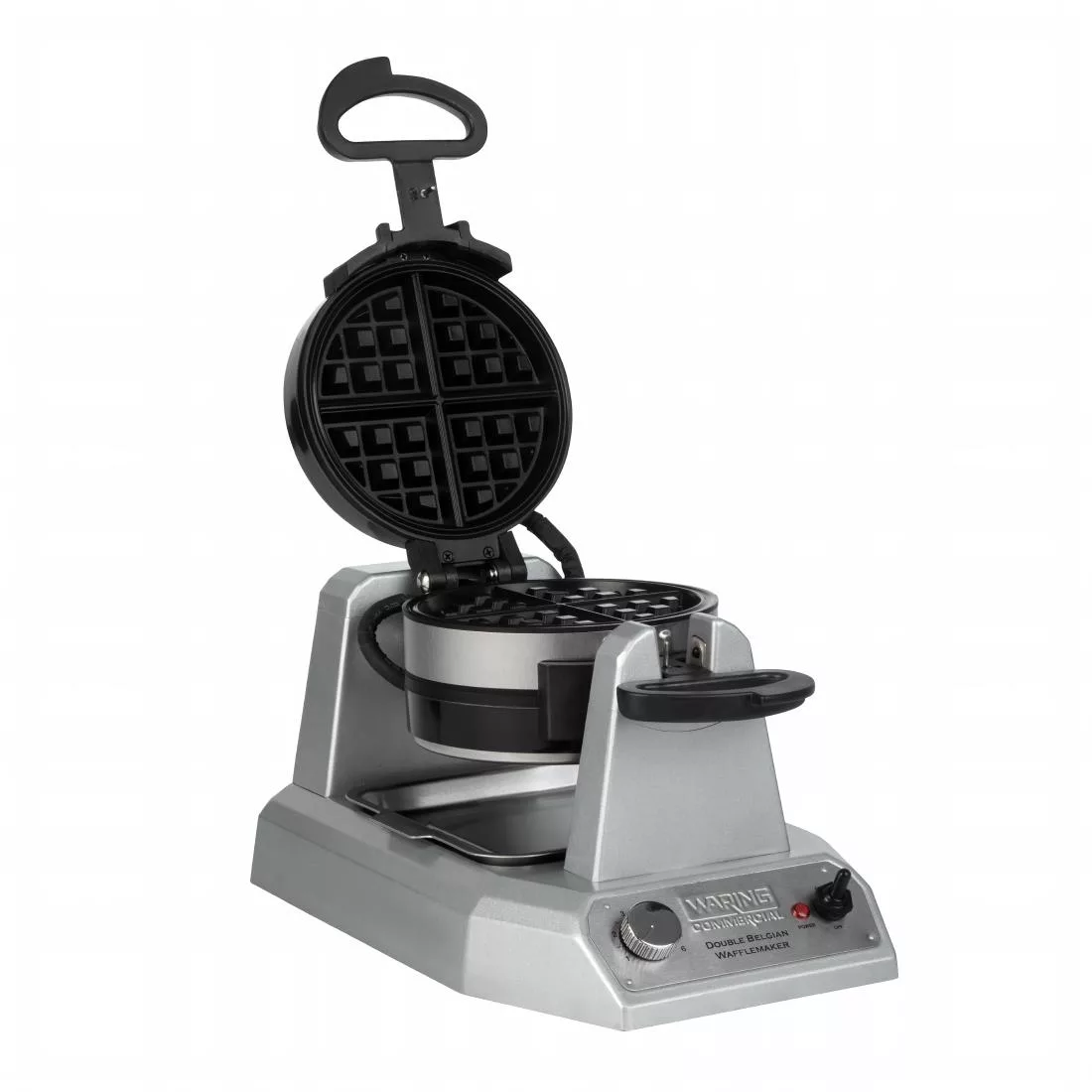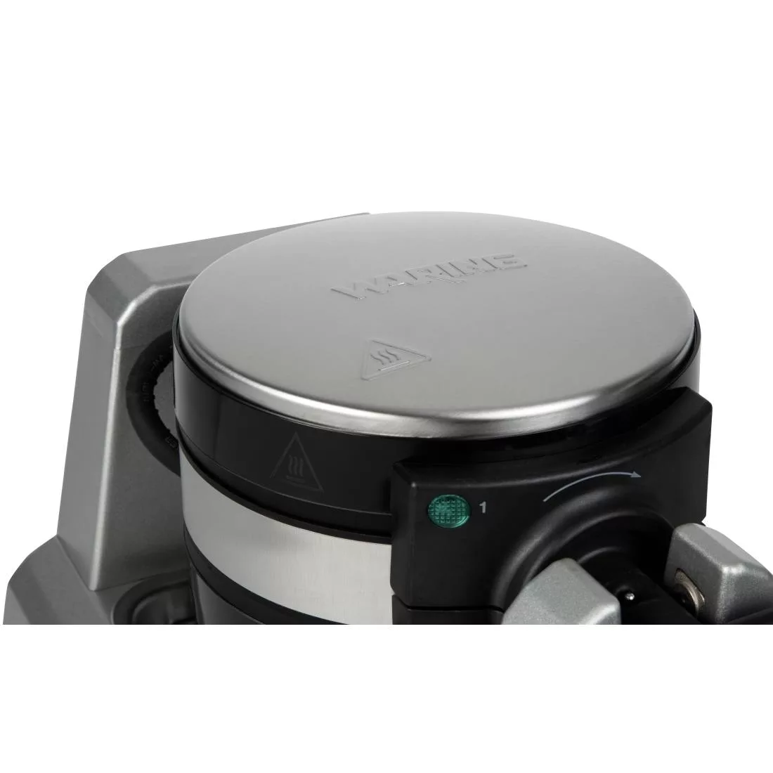 This double die-cast stainless steel waffle maker by Waring features embedded heating elements for precise temperature control and a rotary feature for even baking and browning. The triple-coated non stick plates allow for easy waffle removal and quick clean up, while the vertical design of the machine creates new space saving.