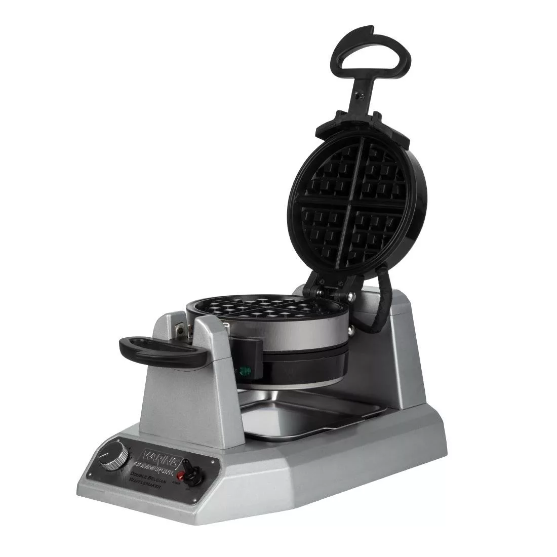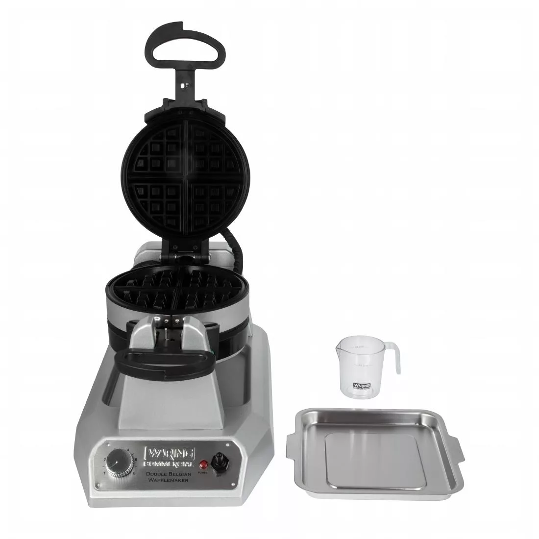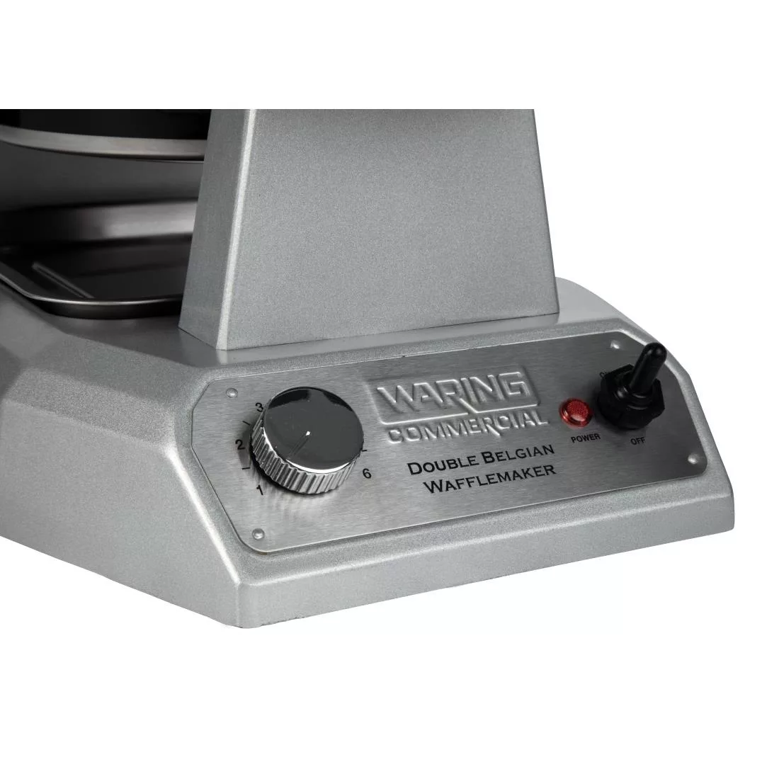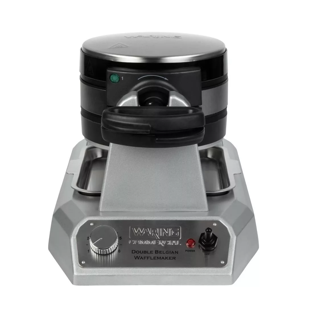 This double die-cast stainless steel waffle maker by Waring features embedded heating elements for precise temperature control and a rotary feature for even baking and browning. The triple-coated non stick plates allow for easy waffle removal and quick clean up, while the vertical design of the machine creates new space saving.