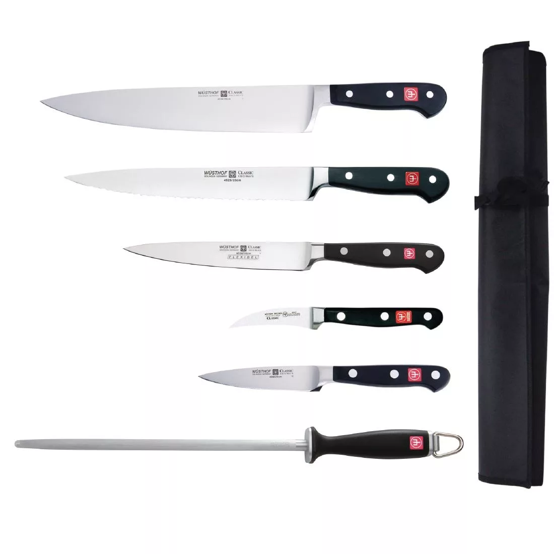 This knife set includes 6 carefully chosen Wusthof knives which will be an asset to any professional chef. Supplied with a nylon wallet to protect and transport your knives.